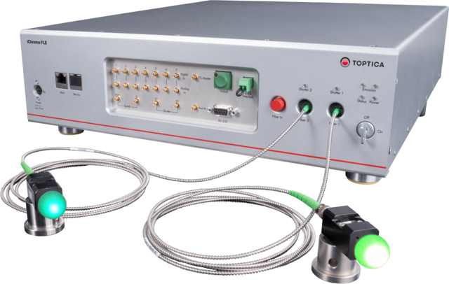 An option available with the iChrome FLE is a separate fiber for up to two wavelengths. TOPTICA’s optical design allows two lasers to be carried in an additional fiber. These could be special wavelengths designed to run in a separate beam path (e.g. 405 or 780 nm, which are corrected separately within the microscope). Another option is to double an existing wavelength for simultaneous high-power operation (e.g. 405 or 488 nm for a separate FRAP input of a microscope).