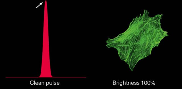 The combination of a high temporal pulse quality (a “clean pulse”) and a short pulse duration at the sample plane gives the best contrast and brightness of 2-photon fluorescence microscopy images.